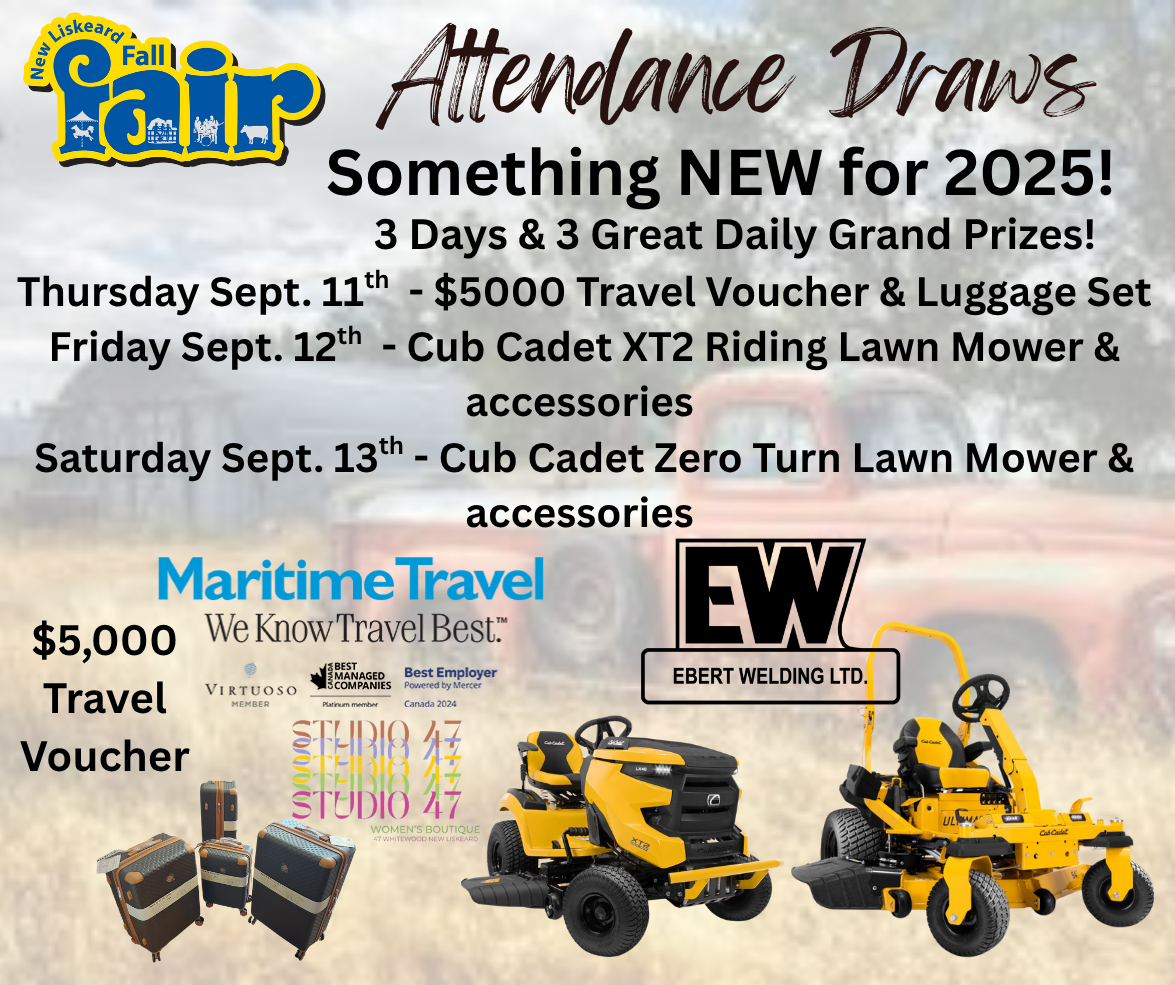 Each night of the Fair will have will have its own Attendance Draw, which is for a Grand Prize and separate from every other night’s draw and prizes.